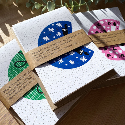 A collection of colourful graphic A6 greetings cards printed on 350gsm recycled paper. Each card arrives plastic free with easily removable card catch stickers.