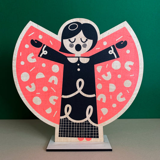 Wooden Screen Printed Angel - Nellie - Neon Red Wings